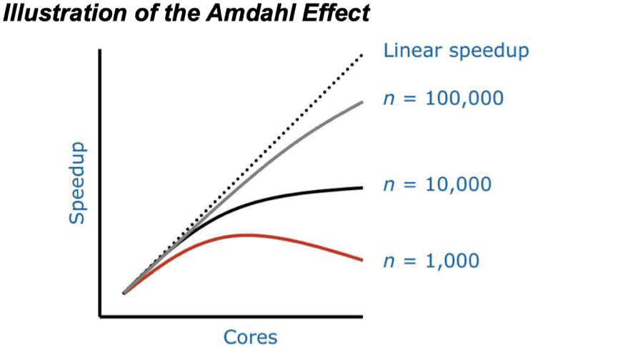 \[Speedup = \frac{1thread\, execution \, time }{n\, thread \, execution \, time}\\ Speedup = \frac{1}{(1-p)+p/n}\\\]其中,p 表示程序可并发的部分占整个程序的比例。